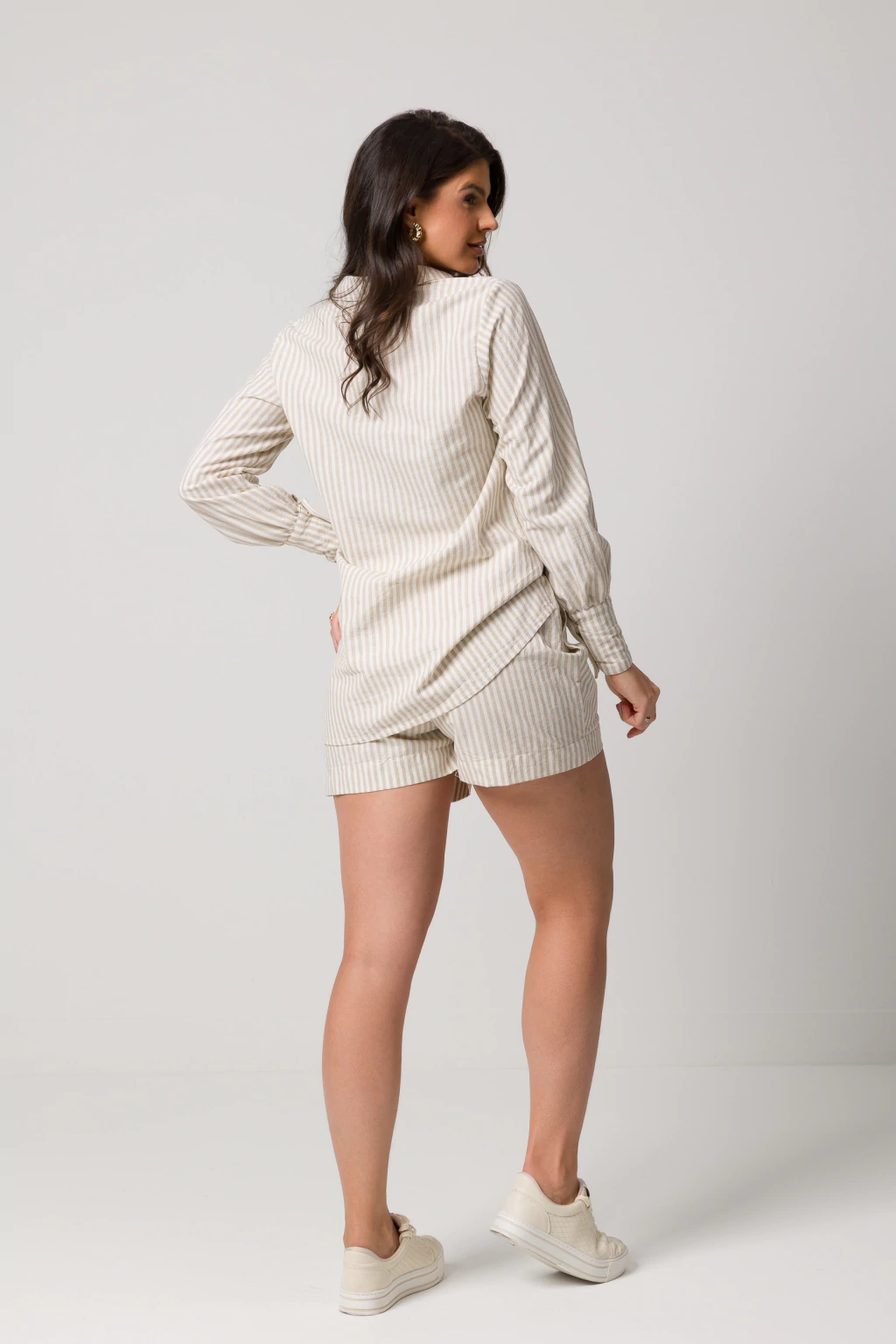 Confeccionado em linho nacional com algodão, esse conjunto combina camisa maxi e short soltinho, ambos em listras delicadas em nude e off-white, criando um visual leve, elegante e fácil de usar em diversas ocasiões.