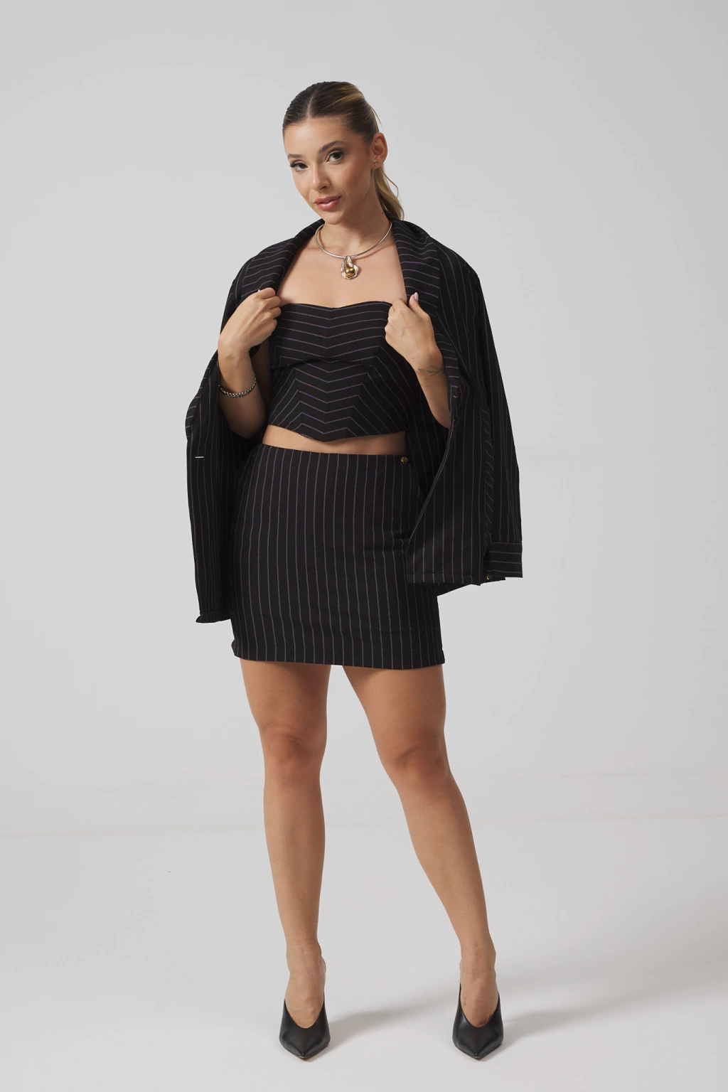 Apresentamos o trio mais elegante, clássico e atemporal da Rose Slaibi – a combinação perfeita de Corpete, Short-Saia e Blazer, pensado para compor um visual sofisticado e moderno.